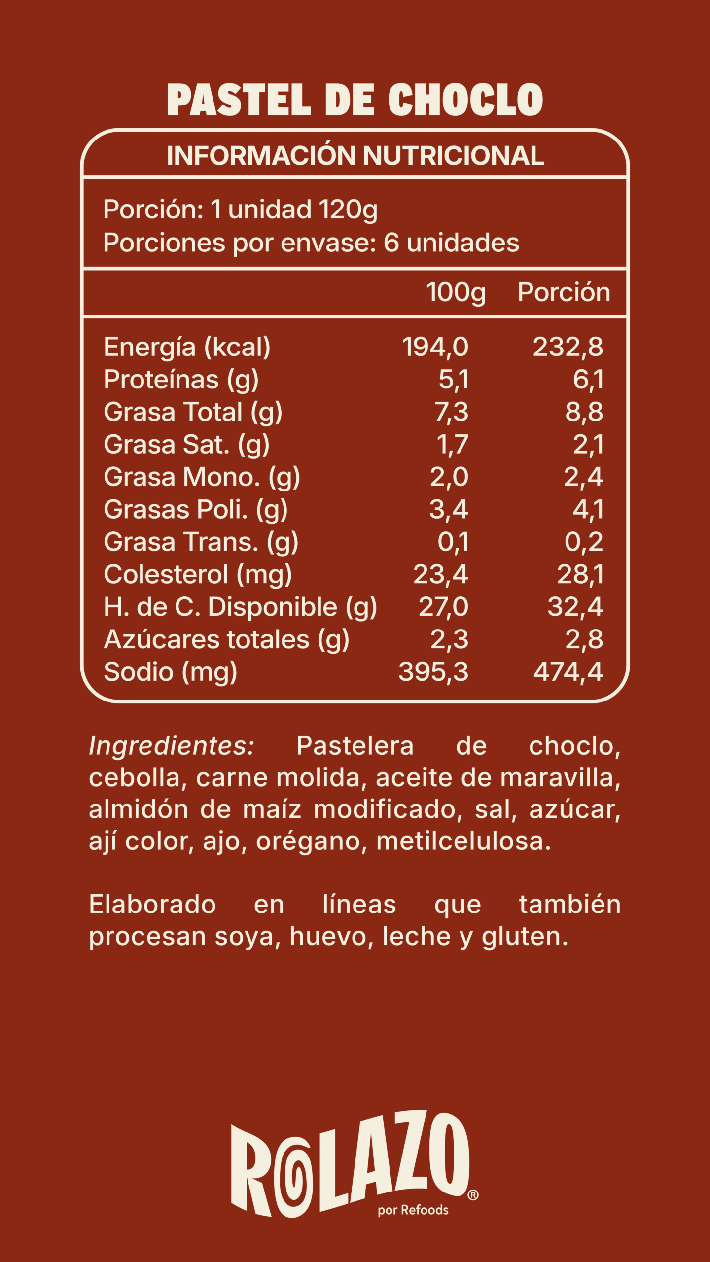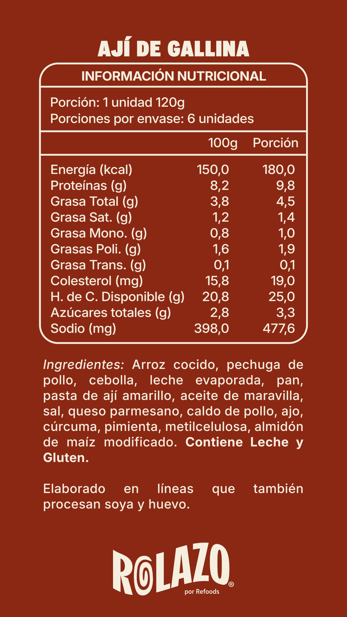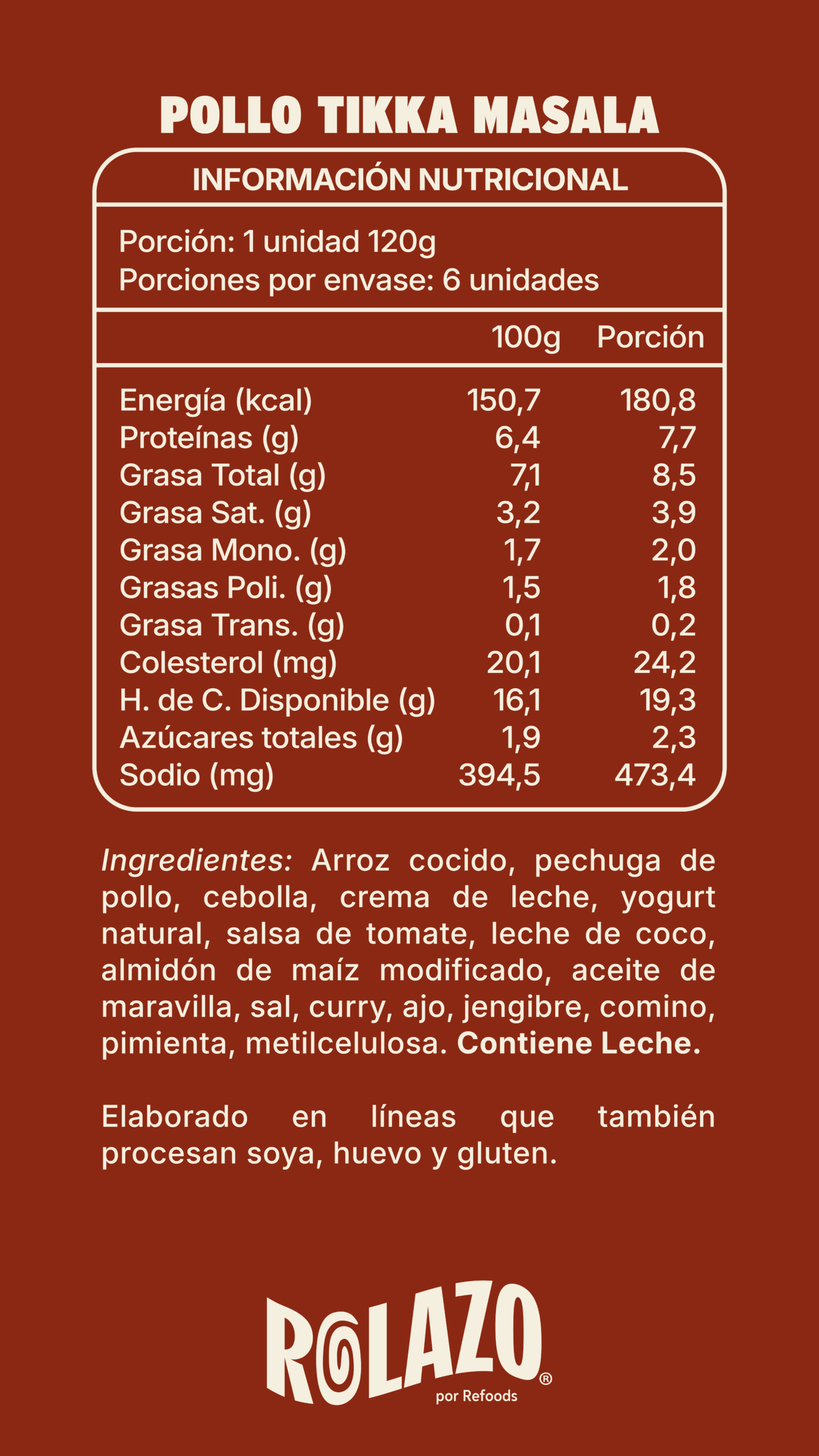 Ingredientes: Arroz cocido, pechuga de pollo, cebolla, crema de leche, yogurt natural, salsa de tomate, leche de coco, almidón de maíz modificado, aceite de maravilla, sal, curry, ajo, jengibre, comino, pimienta, metilcelulosa. Contiene Leche.